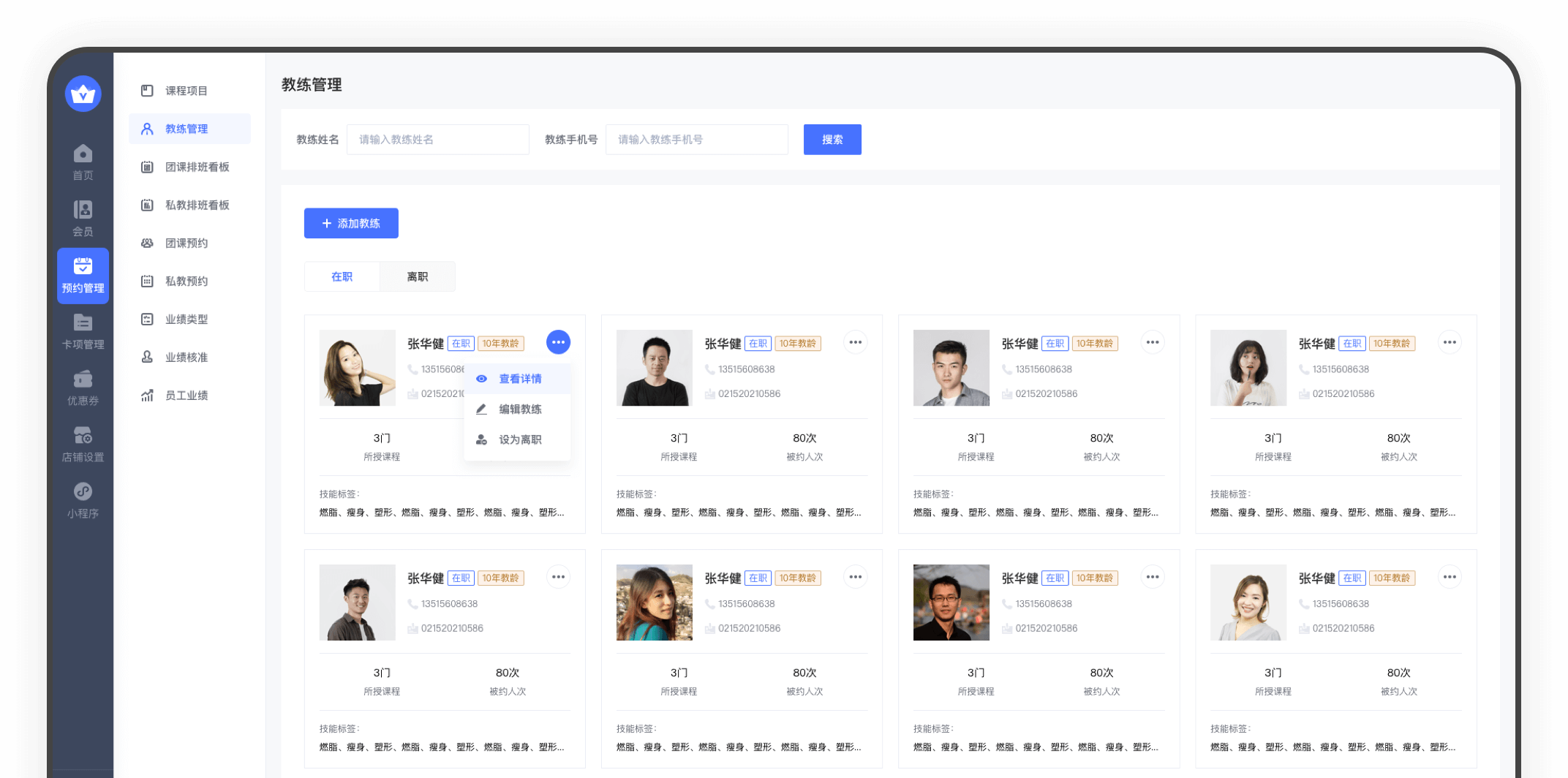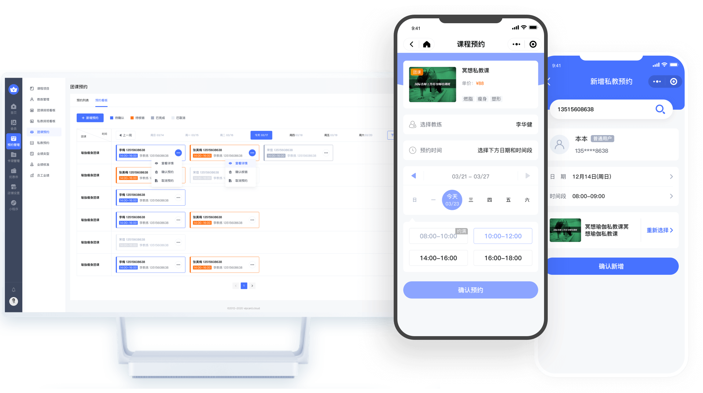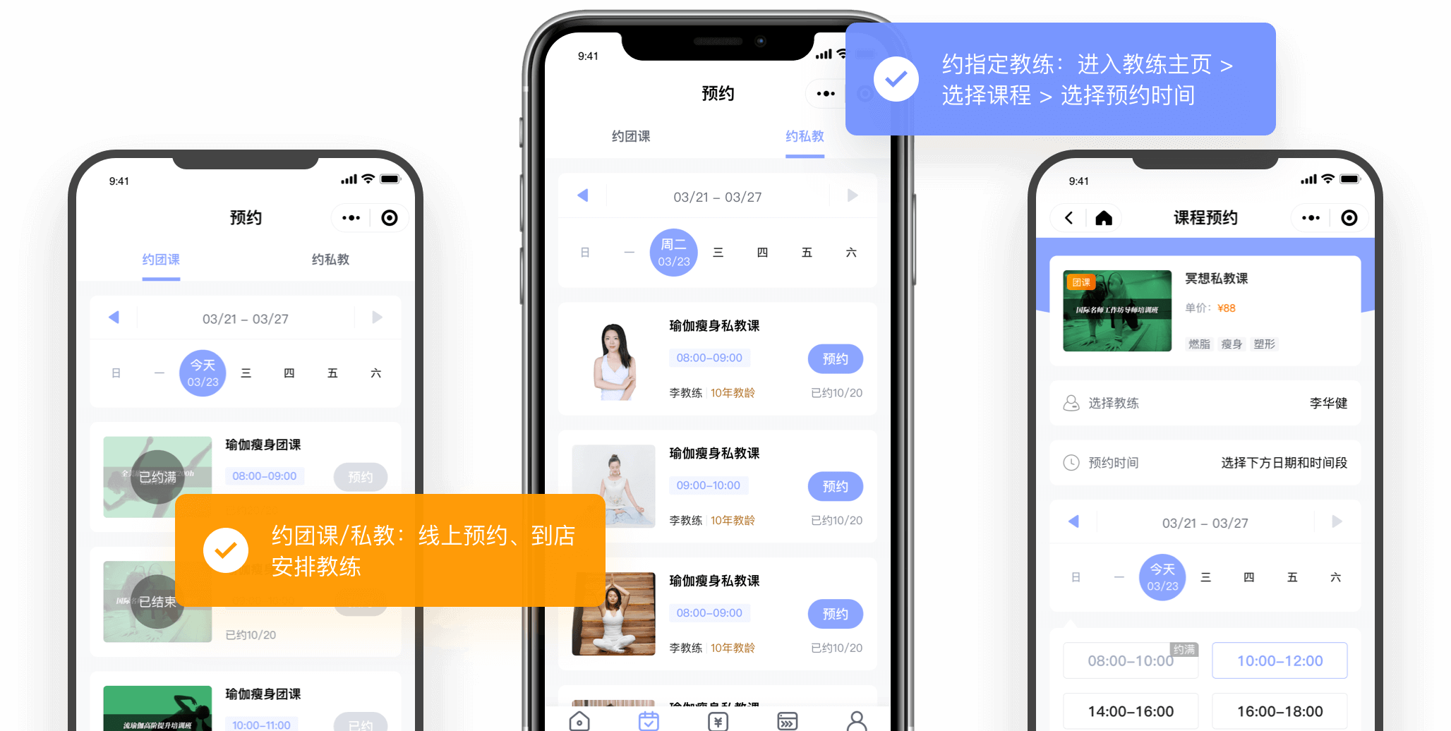 会员端自助预约、教练添加预约、代预约等多种预约方式,课程预约不麻烦